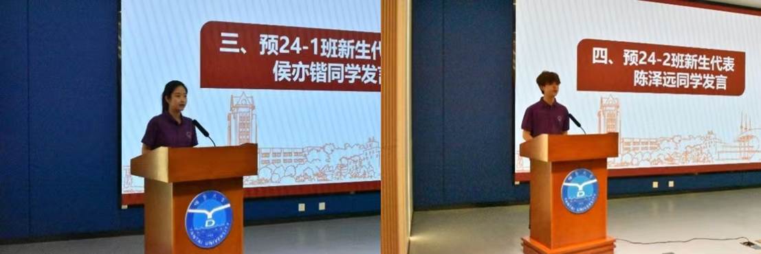 预24-1班新生代表侯亦锴分享了做为军训标兵的获得感,倡议同学们尽快适应大学新生活,明确学习奋斗目标,并全身心投入到学习中去。预24-2班新生代表陈泽远表示将不辜负学校和学院的期望,与大家一起积极面对困难和挑战,敢于突破自我,勇于追梦逐梦。